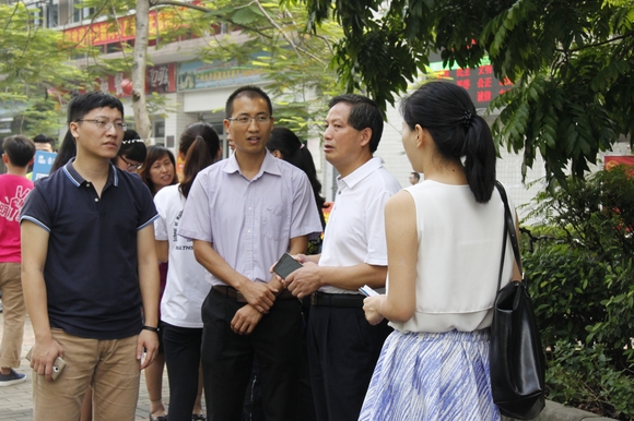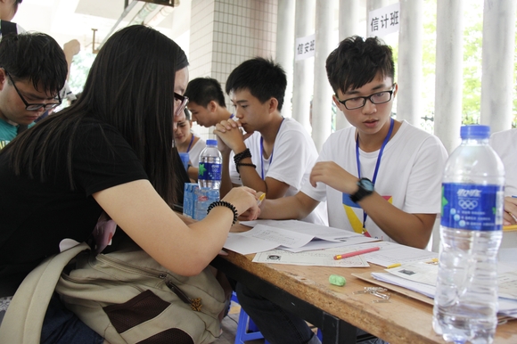 党委书记何建勋教授、副书记曾学毛同志、院办主任彭长春老师、学工办主任顾书老师、团委书记兼13级辅导员杜亚辉老师、14级辅导员胡啟岚老师以及15级辅导员陈启彪等领导老师已到新生接待点并对迎新工作进行指导,他们亲切地问候了远道而来的新生以及家长。其中,有两位家长对数学与应用数学专业的金融、师范、精算以及基地班方向颇有疑惑,曾书记则耐心地为其讲解各个方向的发展方向以及就业前景等。