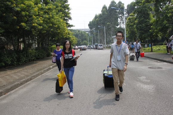 的工作人员和志愿者依旧坚守在迎新的第一线,在各个公交站接应,在接待处为学生和家长倒水,为有需要的新生搬运行李并指引他们达到目的地。