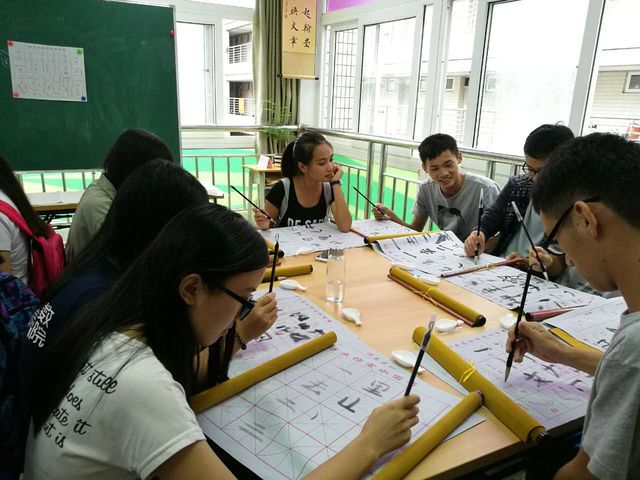 继苗老师演示之后同学们也开始动手模仿苗老师的姿势开始练习。随着同学们的跃跃欲试,活动也进入到白热化阶段。在这期间苗老师甚至用磁铁把水写布贴在黑板上一笔一划地指导大家,防止在大家练习的时候大家走弯路。