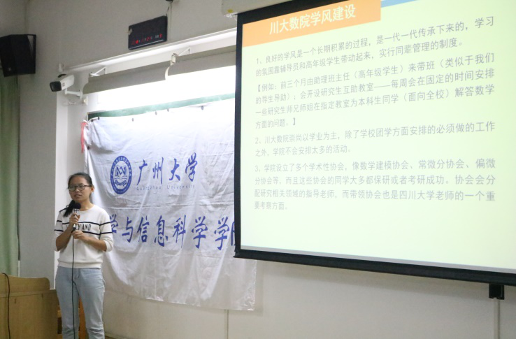 10月21日,由10名本科生和12名研究生组成的访学团前往国家双一流高水平综合性全国重点大学——四川大学,进行为期一周的访学活动。访学小组怀着满满的收获而归,而此次交流会便是向数院的学生分享一周访学的所感所想,所获所得。
