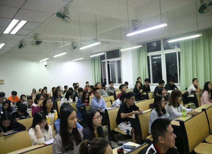 第一个是访学小组18级的本科生代表丁圣琪进行发言,丁圣琪同学向我们分享了川大的概况以及在川大课堂的学习经历。川大上课的课室前排都是满的,而且上早课没有出现打瞌睡现象,并通过举一些例子:例如川大的12点准时断电断网等,与我们进行对比,来反映我们自身的不足之处,并加以改进。