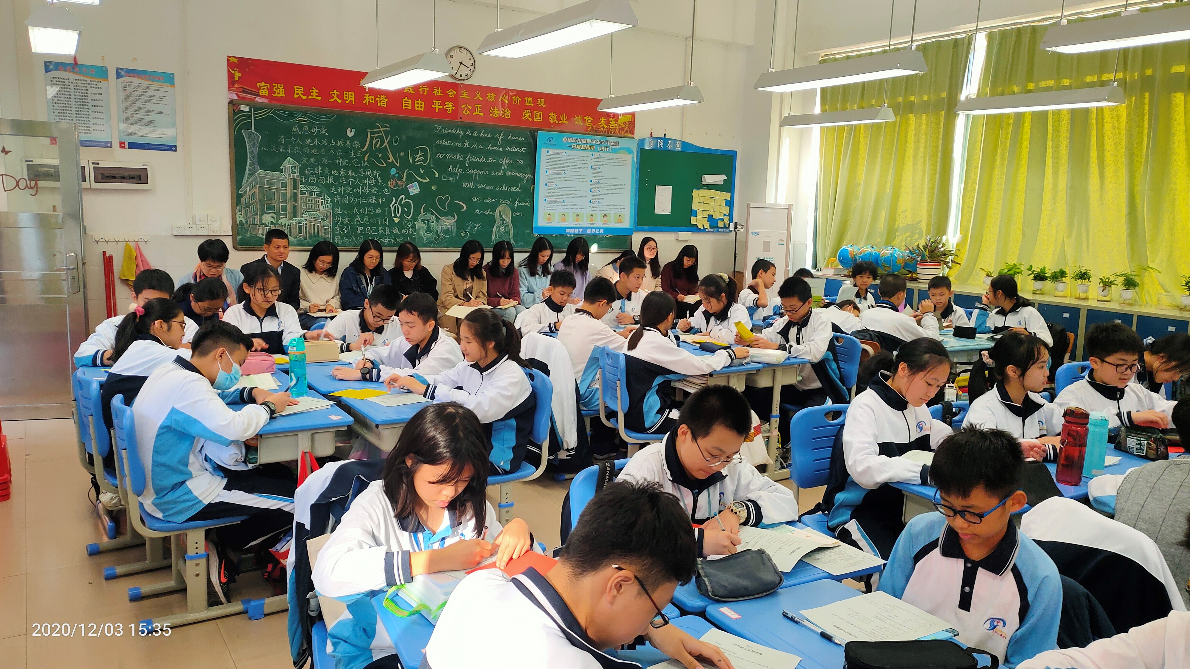 12月3号下午,实习巡查组来到天河外国语学校,听取了朱柏蓉在初一(5)班开展《平方差公式》的公开课,同时参与听课的还有天河外国语学校实习的11名实习生以及初一年级级长兼初一(5)班的学科老师罗海城老师。