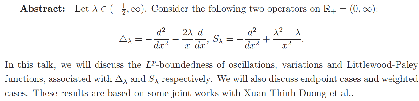 杨东勇,2010年于北京师范大学获得博士学位,现为厦门大学数学科学学院教授。研究方向为调和分析,主要从事与微分算子相关的函数空间及奇异积分算子的有界性,以及度量测度空间上的函数空间及其应用的研究。目前发表论著50余篇,包括Math. Ann., J. Funct. Anal., Rev. Mat. Iberoam., J. Anal. Math., J. Geom. Anal. 和Indiana Univ. Math. J等国内外学术期刊.。